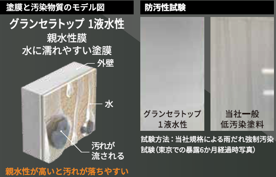 親水性の高い塗膜により、外壁に付着した汚れを雨水と一緒に洗い流す“セルフクリーニング効果”が働きます。