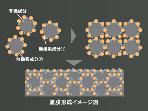 そこで、日本ペイントは「無機成分」と「有機成分」をハイブリッド化することで、両者の弱点を補いながら性能を強化しました。