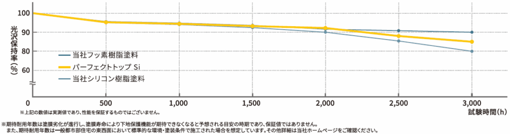 この試験結果が示す通り、パーフェクトトップ Siは、促進耐候性試験において、当社従来のシリコン樹脂塗料を大きく上回り、フッ素樹脂塗料に匹敵する光沢保持率を長期にわたり維持しています 。
