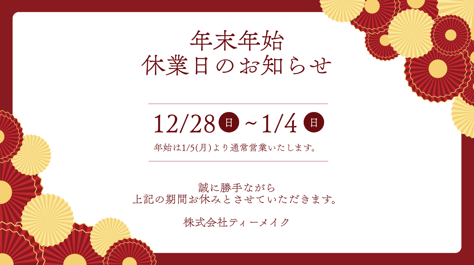 なお、年末年始の休業期間につきましては