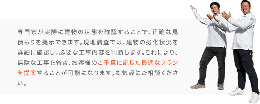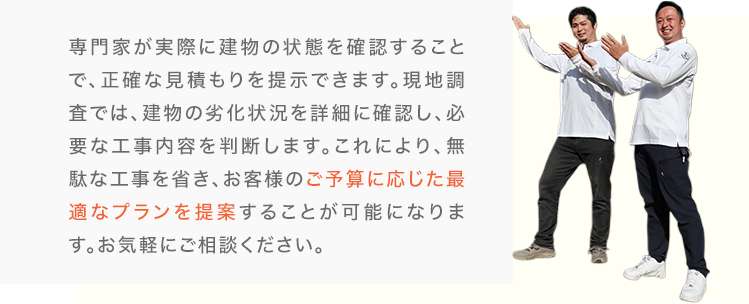 私たちは一軒一軒、建物の劣化状況を詳細に確認し、安心と納得のいく適正価格と施工計画をご提示します。